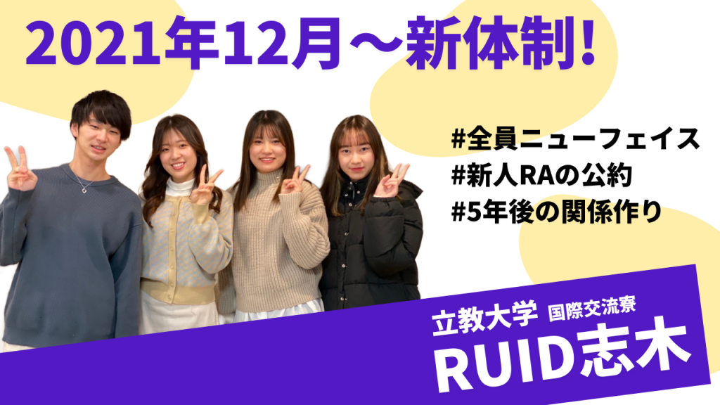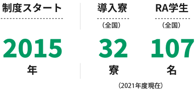 日本全国で約1,300校の学校法人と提携して学生寮を展開する株式会社共立メンテナンスでは、学生同士が刺激し合い、コミュニケーションを創出する「学びと育成の場」を目指し、スタートしたRA(レジデント・アシスタント)制度。2021年12月現在、首都圏・関西・広島の32箇所の寮で、107名のRAが活動しており、専属チームがRAたちの活動をサポートしています。RA制度を採用する寮は今後ますます増えていくことを予定しています。RAは、寮のコンダクターとして、新入生のサポートやイベント企画など、日々の生活を支える役割を担っています。